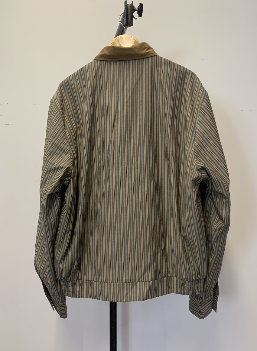 Designed in a vintage striped fabric with a lapel collar and asymmetric front opening with patch detail. The clean, structured silhouette has strong design appeal and practicality. An adjustable belt at the hem adds dimension and a finished look — great for everyday commuting, street style, and vintage-inspired outfits.