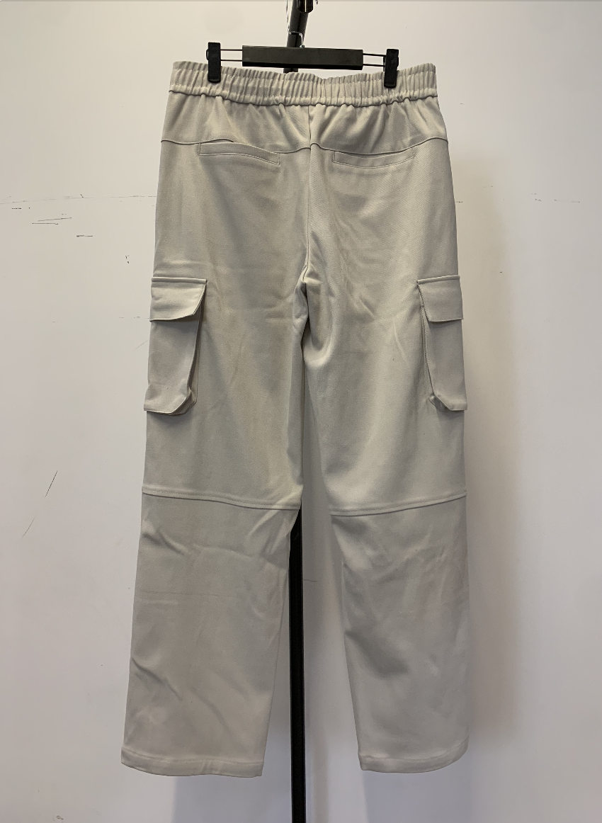 A clean, straight-leg pants design featuring dual side cargo pockets and an elastic waistband for a relaxed yet practical look. The natural drape of the fabric makes these great for everyday outings, casual wear, and cargo-inspired styling.