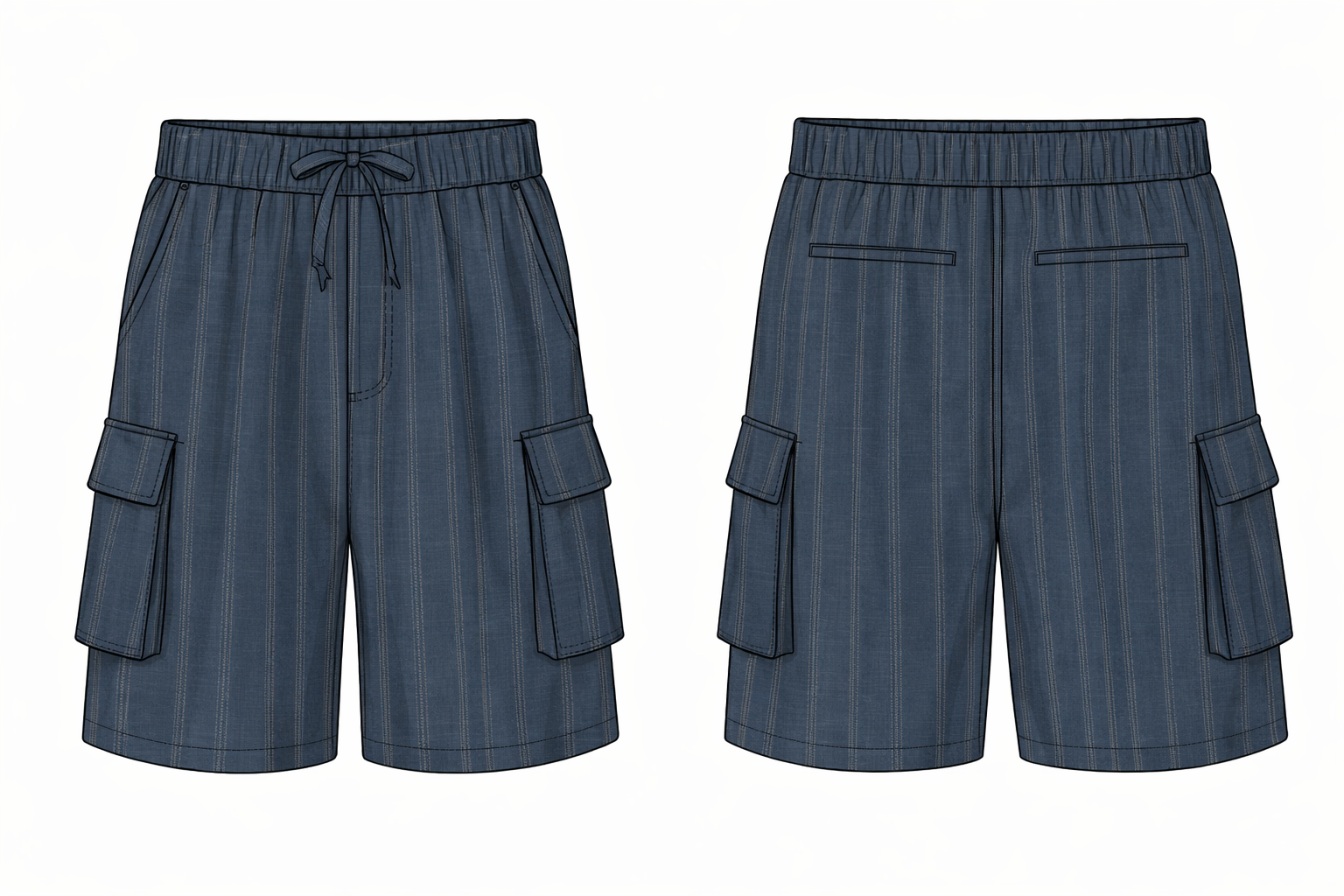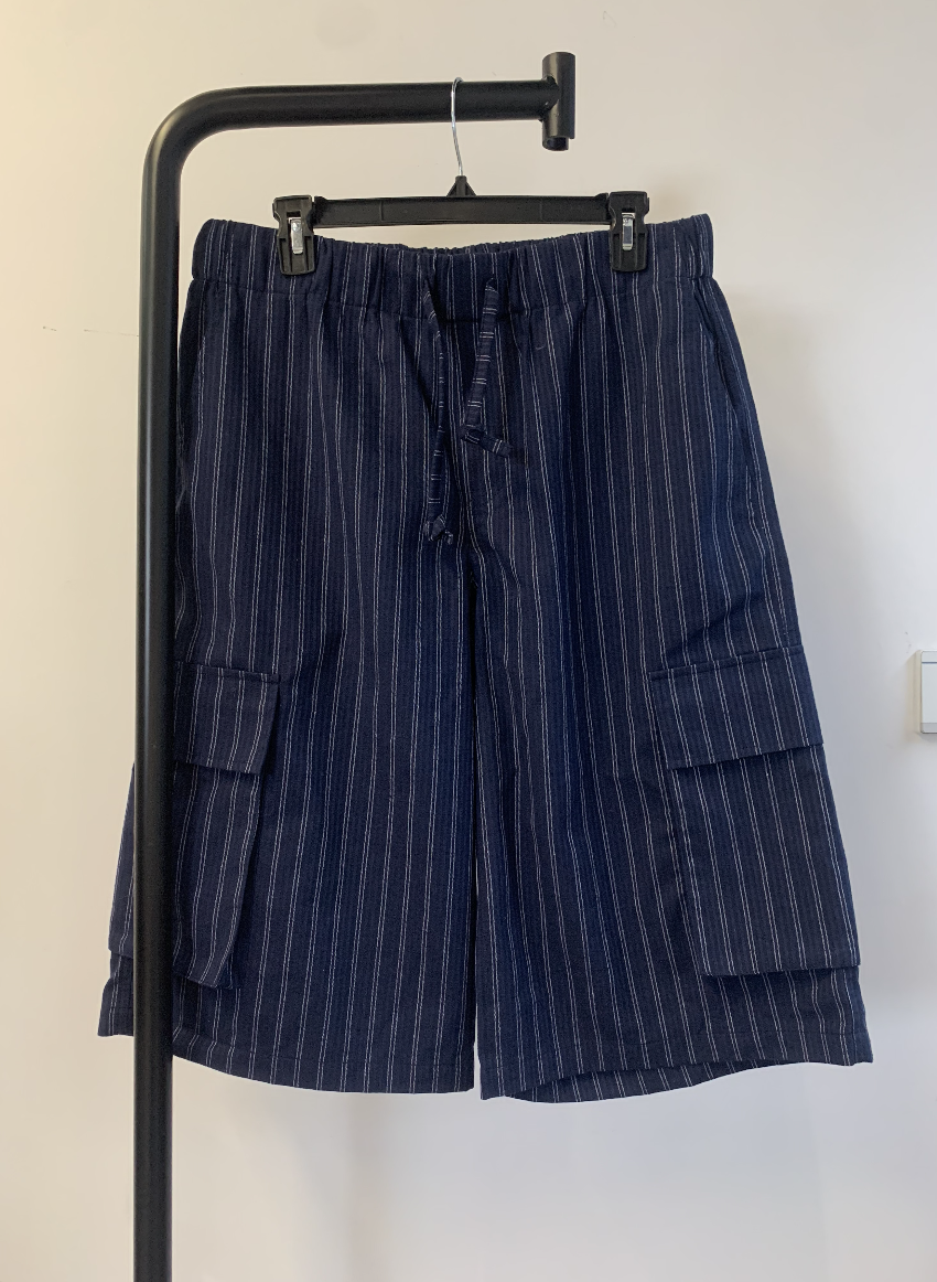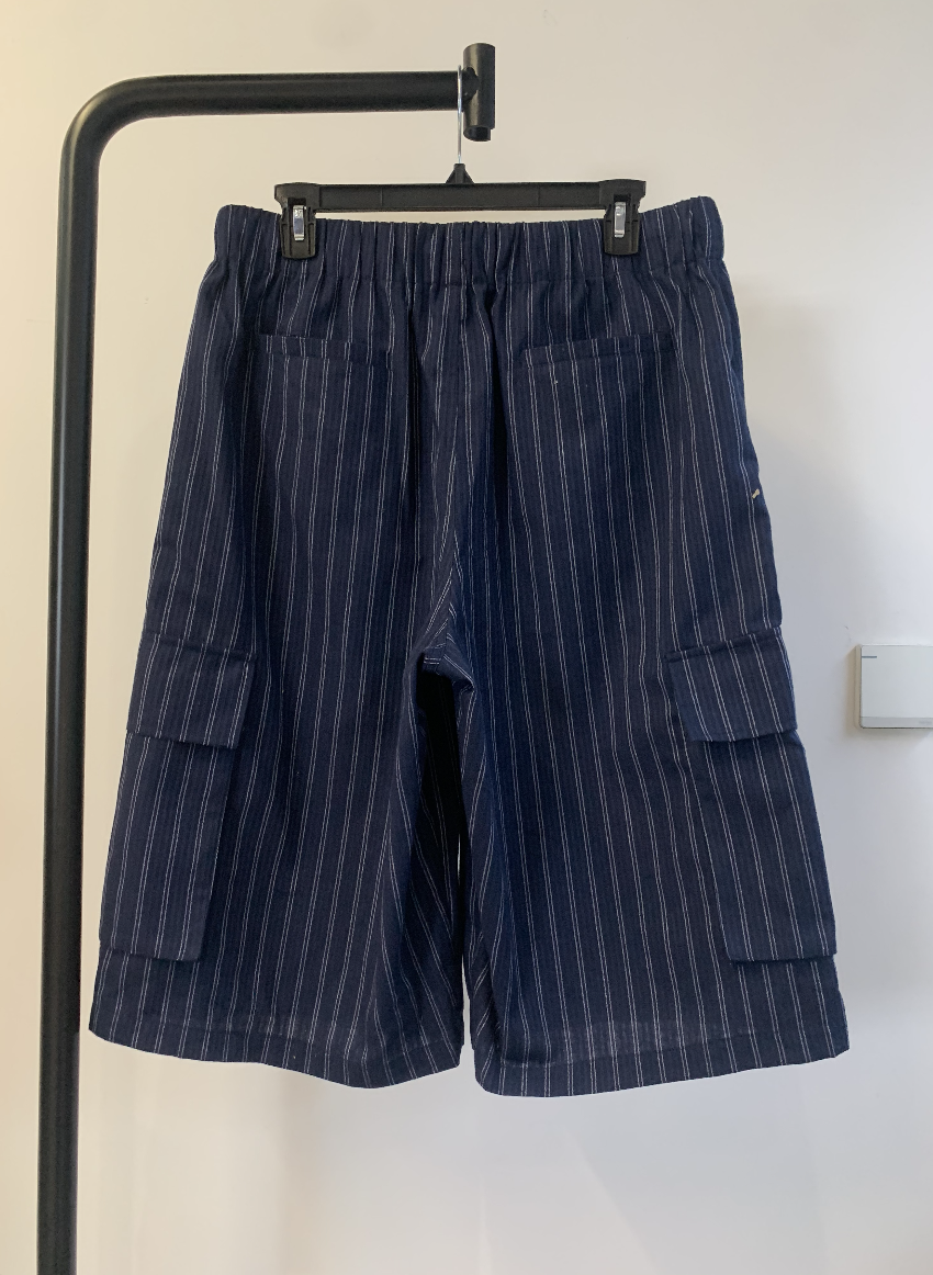 Designed in a vertical stripe fabric with a relaxed shorts silhouette and multi-pocket cargo details for a casual yet practical look. An elastic waistband with drawstring makes these easy to wear — great for everyday outings, casual wear, and summer street style.