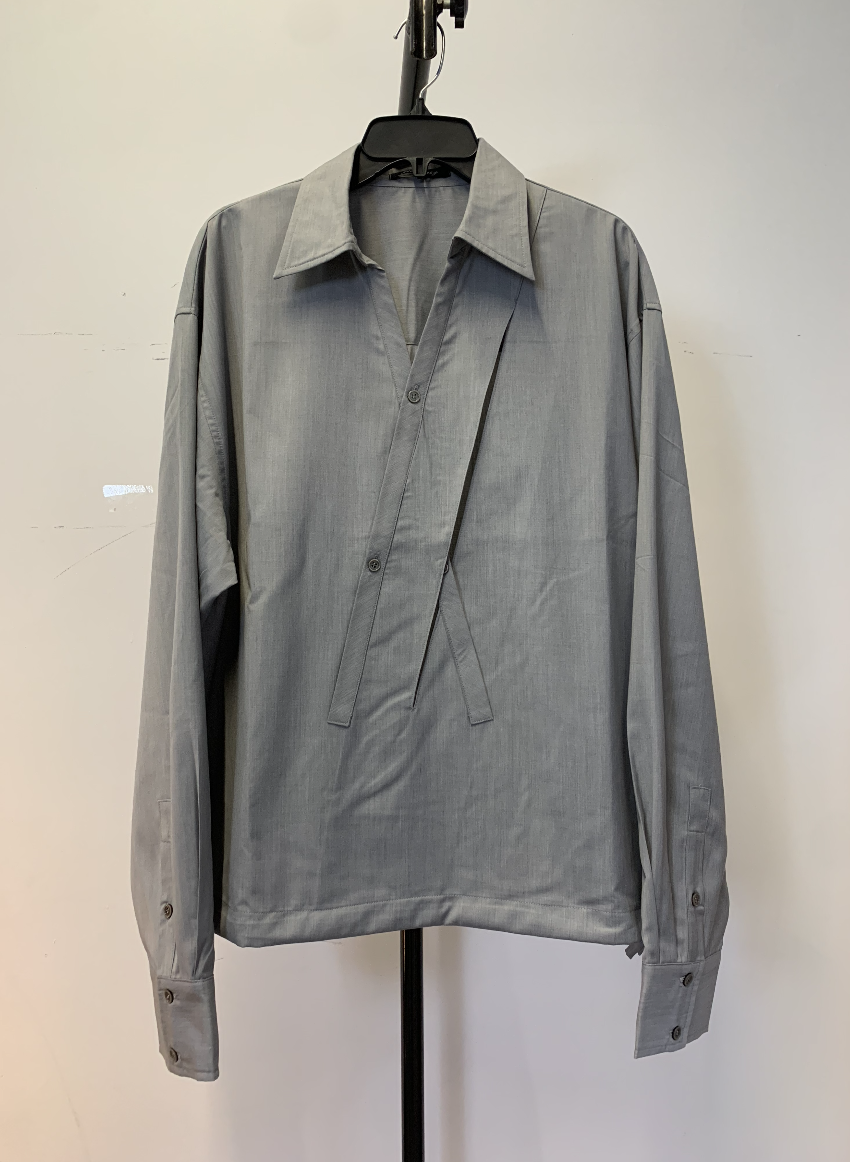 Style 02A relaxed long sleeve shirt with a collared neckline, half-open placket, and front tie detail for a clean yet distinctive look. The lightweight, smooth fabric makes it ideal for everyday commuting, casual outings, and minimalist fashion styling.