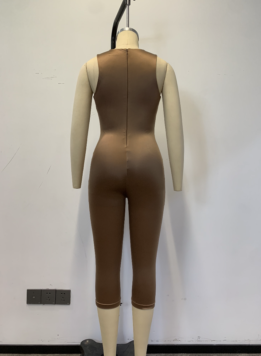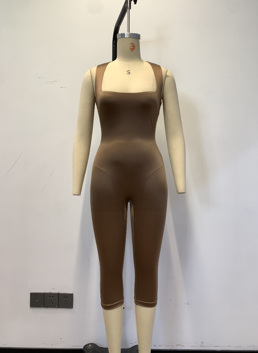 A fitted jumpsuit with a clean square neckline and wide straps for a streamlined, body-conscious look. The capri length adds a polished, effortless touch — minimalist, fashionable, and versatile.