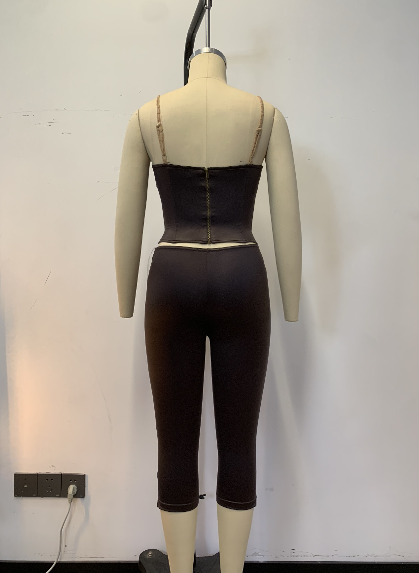 A fitted two-piece set where the top is a strap bandeau-style piece with a center front zipper and lace shoulder strap details. Paired with fitted capri pants for a sleek, polished look β sophisticated, fashionable, and versatile.
