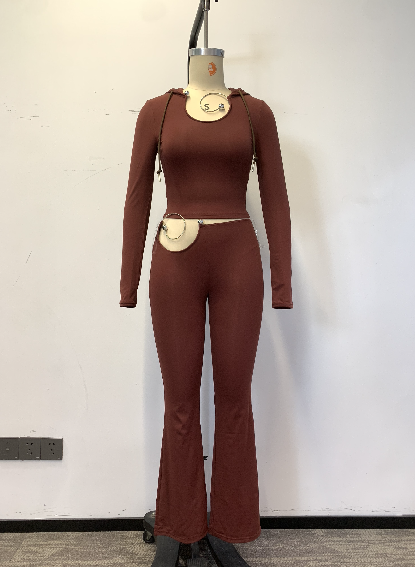 Long-sleeve hooded design with metal ring embellishments at the neckline and waist, plus a front waist cutout. The slight flare hem elongates the legs for a bold, sexy, and fashion-forward look.