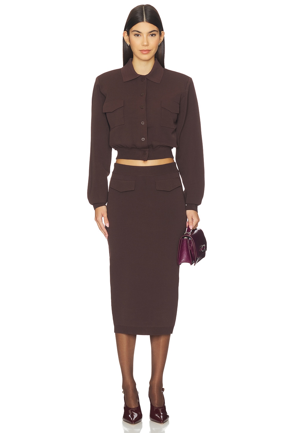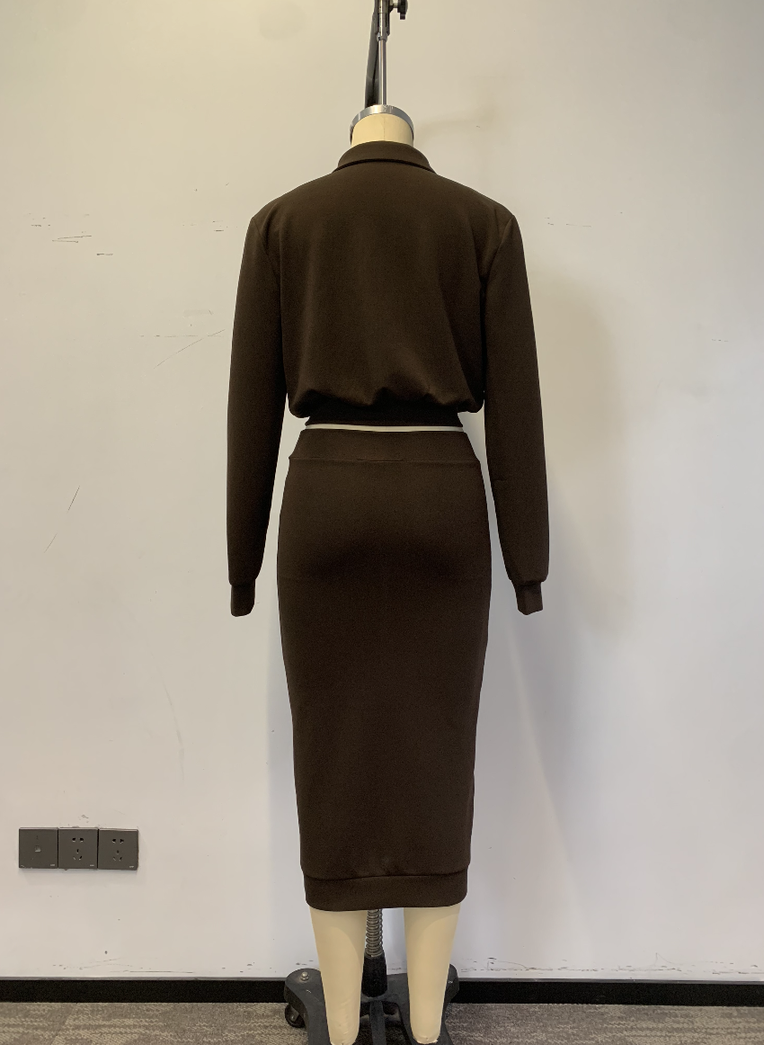 A fitted two-piece set featuring a cropped collared top with front button closure and flap pocket details, paired with a high-waist fitted midi skirt. Clean, polished lines create a sharp yet elegant office-ready look.