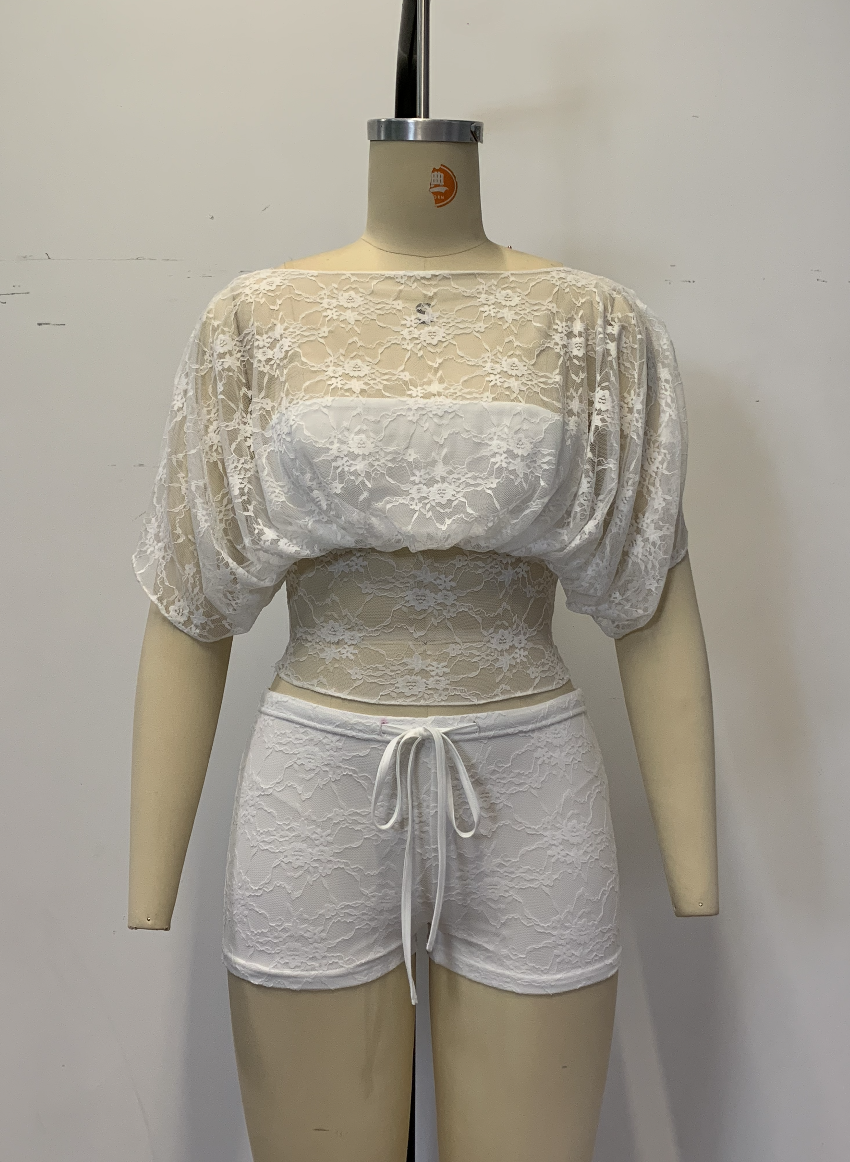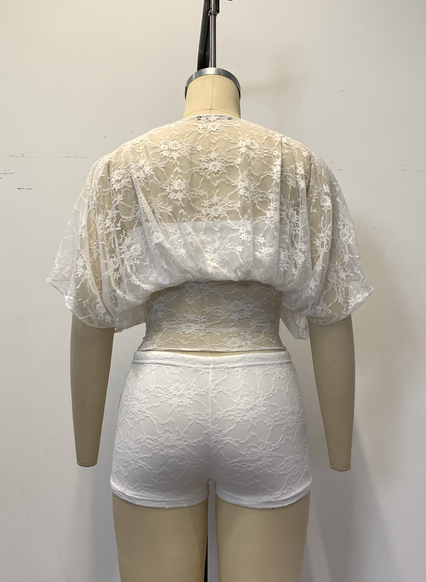 Designed entirely in lace fabric, the top is a sheer short-sleeve blouse with a wide elasticated waist and naturally draped sleeves for an airy, layered feel. Paired with matching fitted shorts for a sweet, soft aesthetic β perfect for resort wear, photoshoots, and French-inspired styling.
