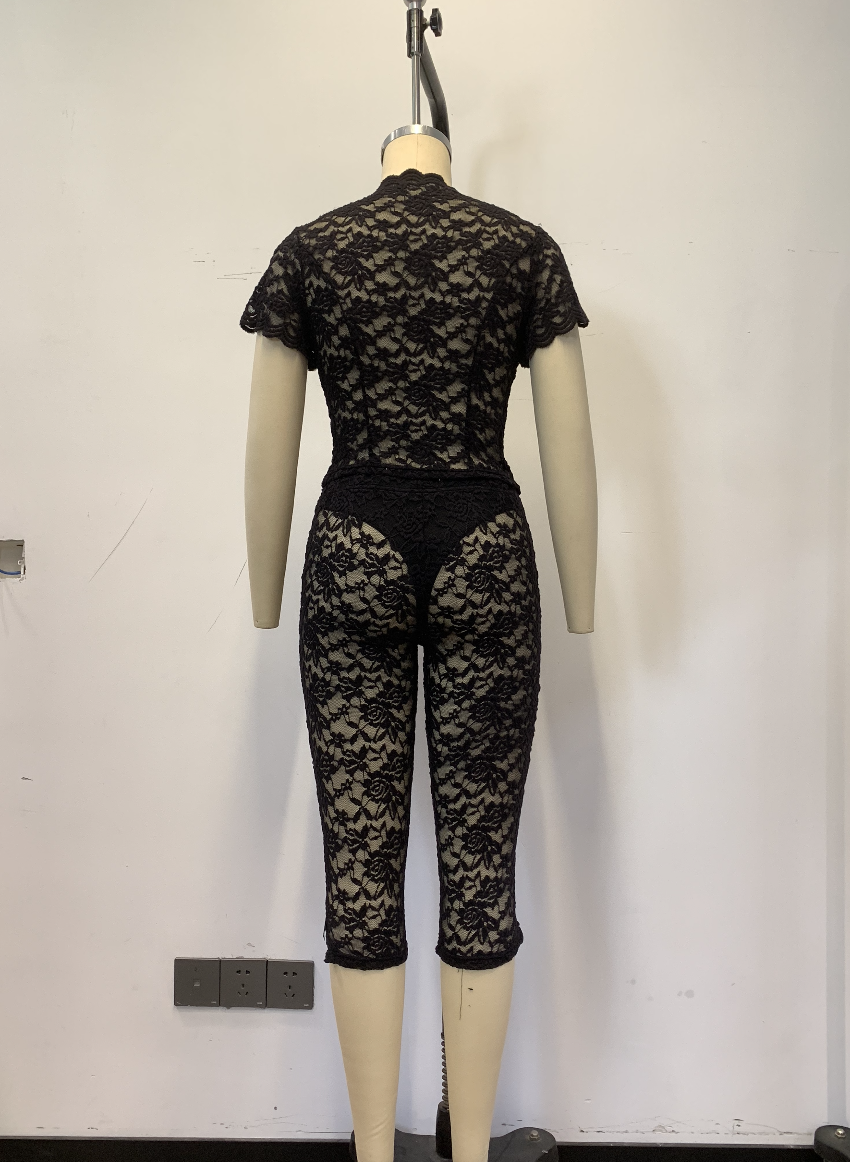 Designed entirely in lace fabric with a short-sleeve cut and deep-V front placket for a body-hugging, figure-flattering look. The capri/mid-length hem adds a layered, fashion-forward dimension β great for styled looks, outerwear layering, and edgy fashion.