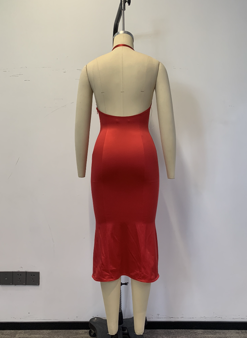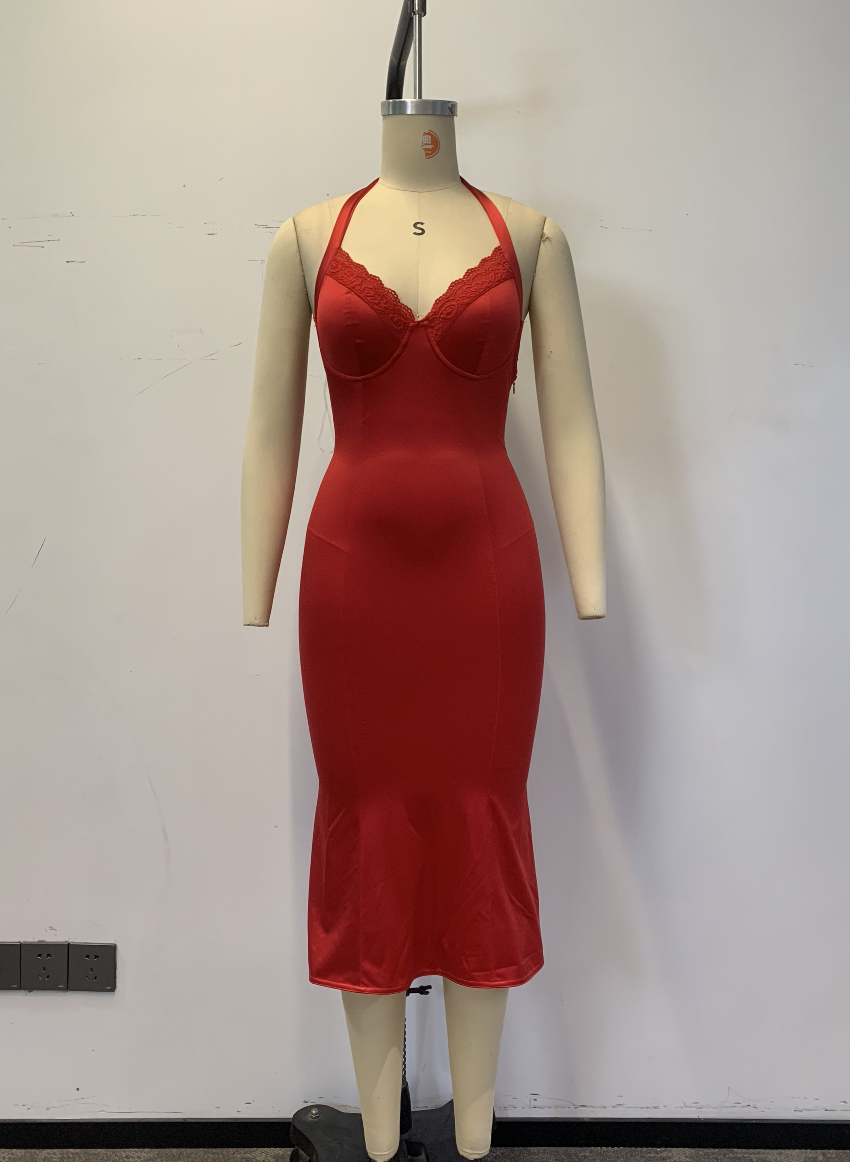 A fitted midi dress with a halter neckline and sculpted cup bodice. Lace paneling at the bust adds a delicate feminine touch to the smooth, body-skimming silhouette β ideal for formal dinners, date nights, and semi-formal occasions.