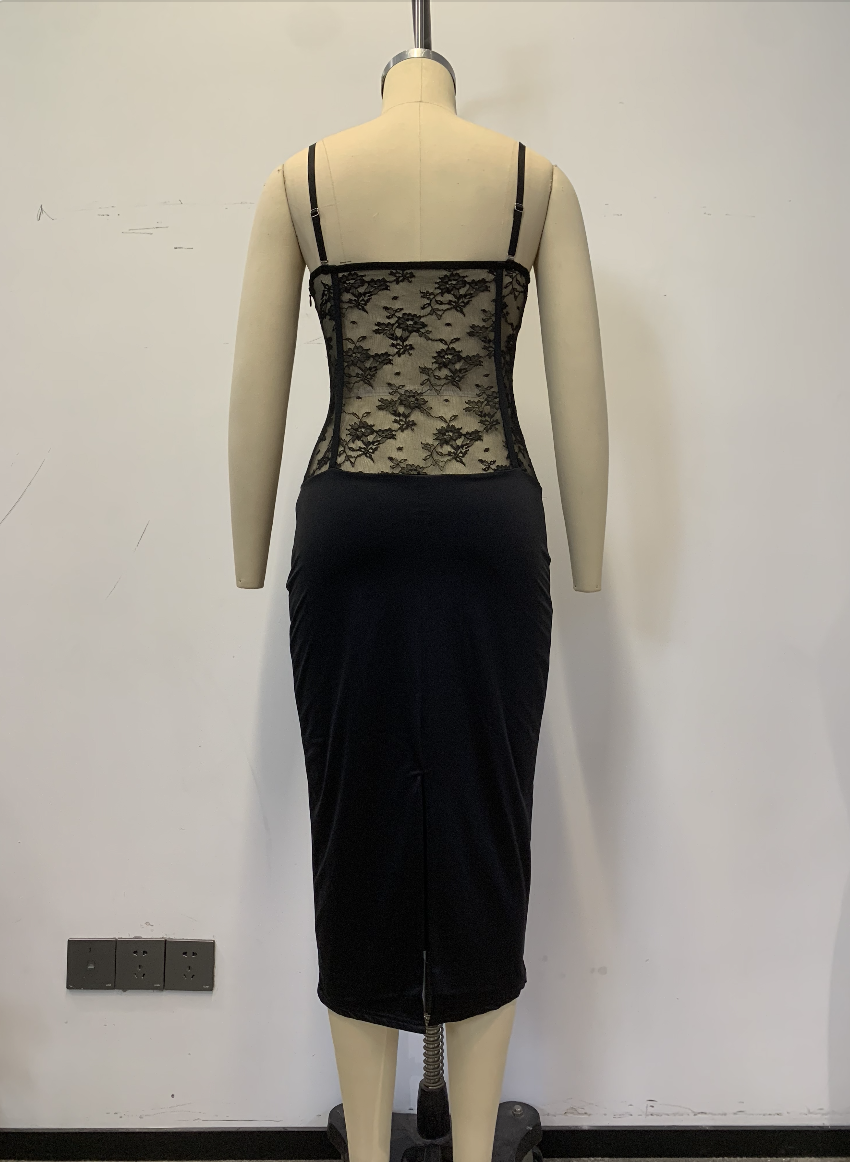 A fitted midi dress with thin spaghetti straps and a 3D cup detail. Sheer lace paneling on the bodice accentuates curves while the clean, fluid skirt completes an elegant, sensual, and sophisticatedly feminine look.