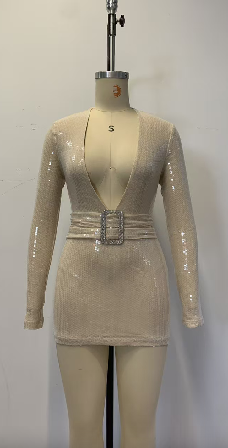 Style 04A fitted mini dress in all-over sequin fabric with a deep V-neckline. A wide cinched waist band with rhinestone square buckle adds glamour, while the open back with cross-strap detail completes this dazzling, sensual party look.