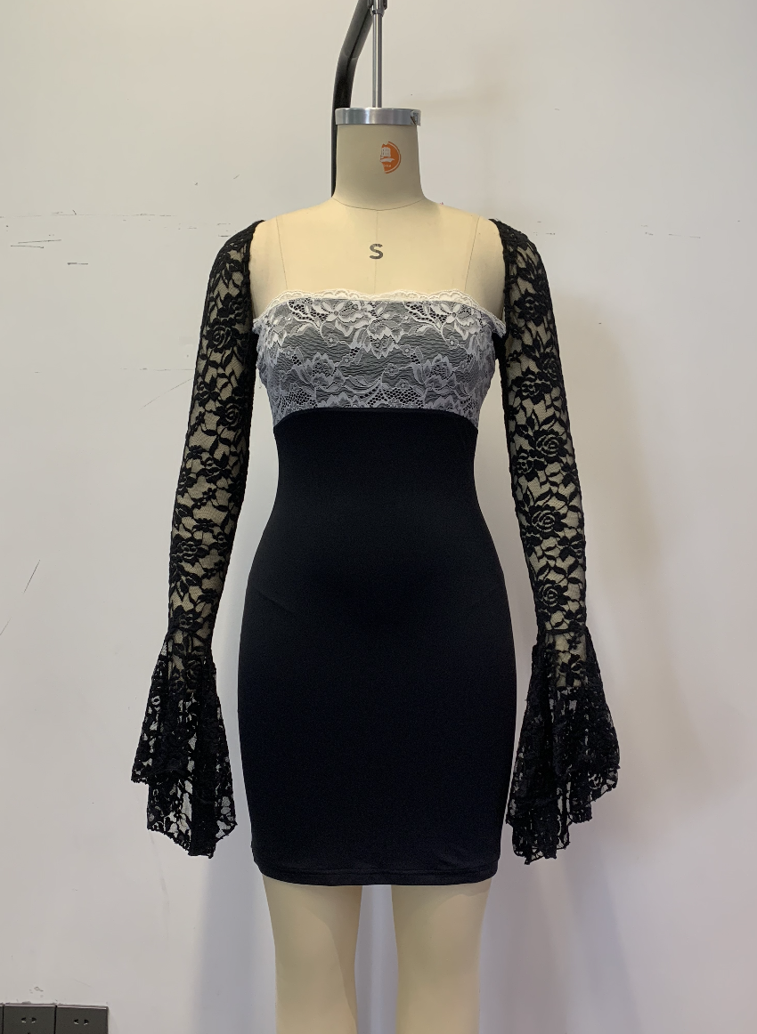 Style 02A fitted mini dress in knit fabric with lace paneling, floral lace and trim layering at the chest, long bell sleeves, and an open back with tie closure — elegant, feminine, and vintage-inspired.
