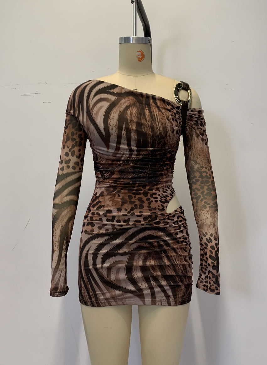 Style 05A fitted mini dress with an asymmetric off-shoulder neckline and leopard/wave print patchwork. Gathered ruching and side waist cutouts add shape, while O-ring shoulder embellishments complete the bold, fashion-forward, and sensual look.