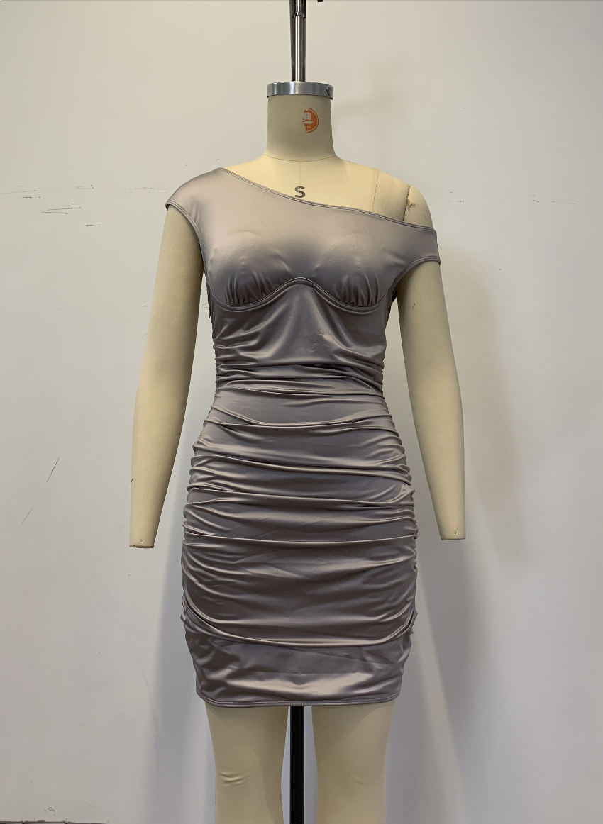 Style 03A fitted mini dress with an asymmetric off-shoulder design and structured bust seams. Dense ruching throughout the skirt creates a flattering, body-conscious silhouette — clean, modern, and sensual.