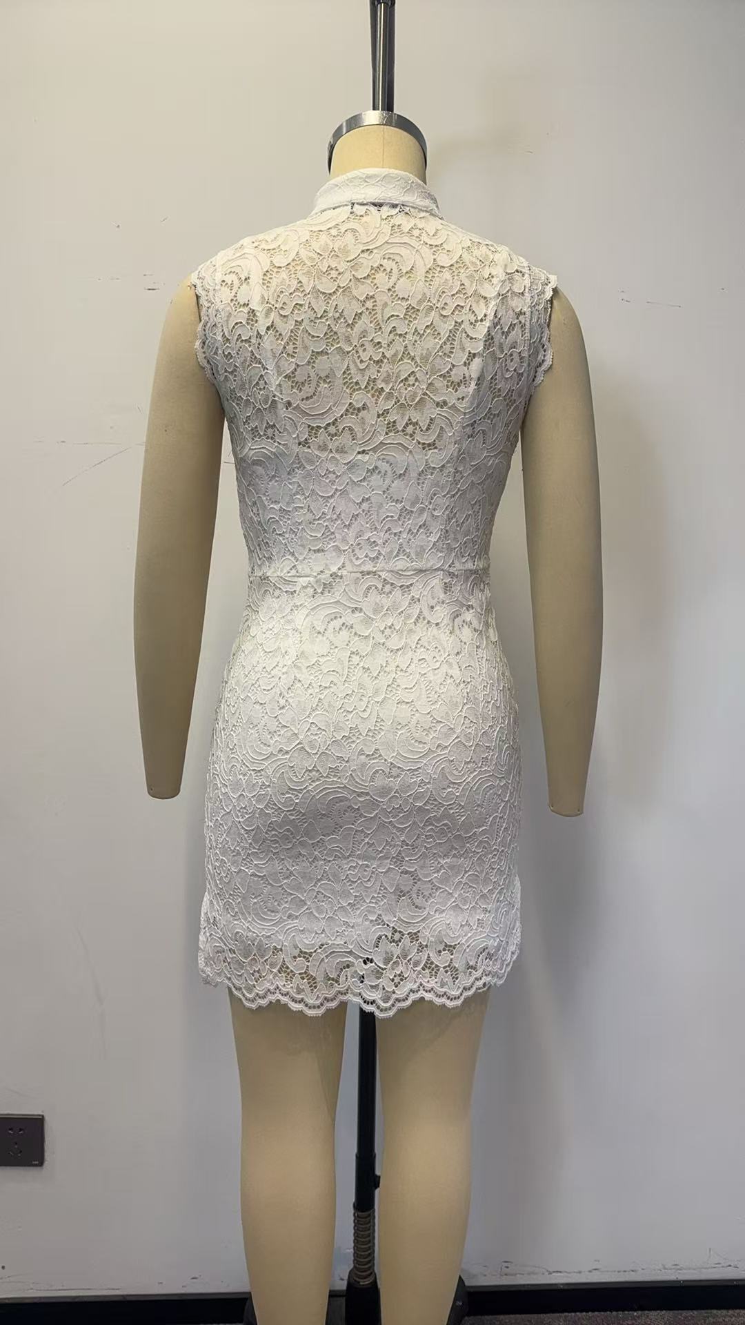 A fitted mini dress in all-over lace with a mandarin collar and frog button closures for a refined Neo-Chinese aesthetic. The smooth silhouette is finished with a lace trim hem for added femininity and dimension β ideal for date nights, festive occasions, and photoshoots.