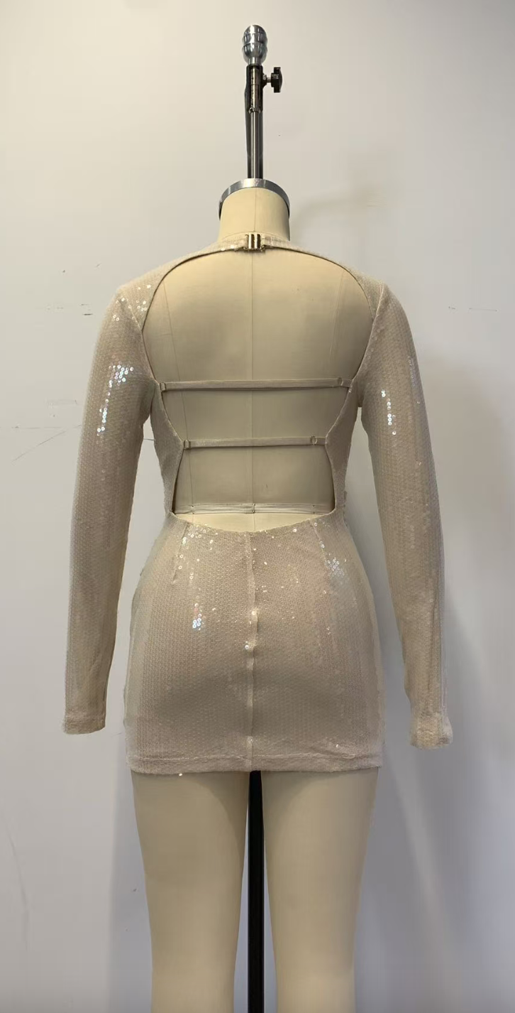 A fitted mini dress in all-over sequin fabric with a deep V-neckline. A wide cinched waist band with rhinestone square buckle adds glamour, while the open back with cross-strap detail completes this dazzling, sensual party look.