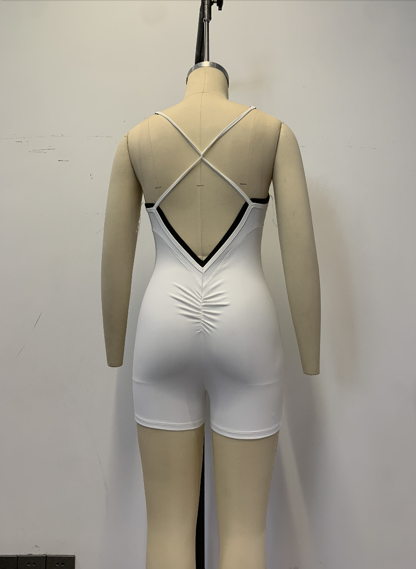 A fitted romper with a clean front, thin straps, and contrast binding detail. The open back with cross-strap design adds striking visual appeal. The body-skimming fit is sleek and stylish β perfect for everyday wear, casual outings, and athletic-inspired looks.