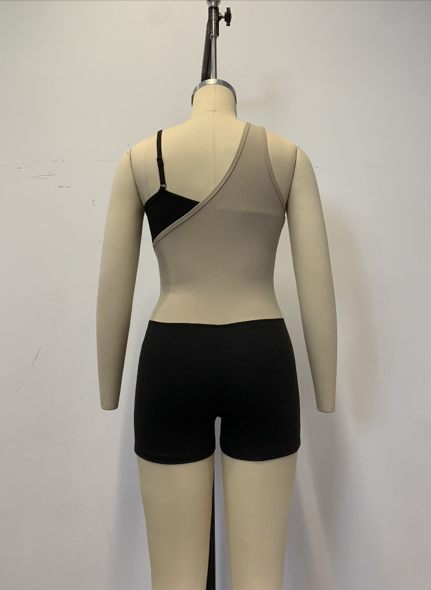 A fitted romper with an asymmetric off-shoulder cut and color-blocked layering detail for added visual interest and a polished look. The smooth, body-hugging fit at the waist and hips is stylishly functional β great for everyday wear, casual outings, and statement looks.